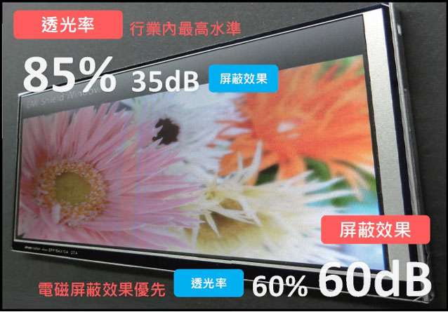 - 在玻璃表面成型超薄的金属网膜,通过扩大网孔间距,实现了行业内最高水平85%的透光率,同时电磁屏蔽效果也达至35dB的实用性能。
