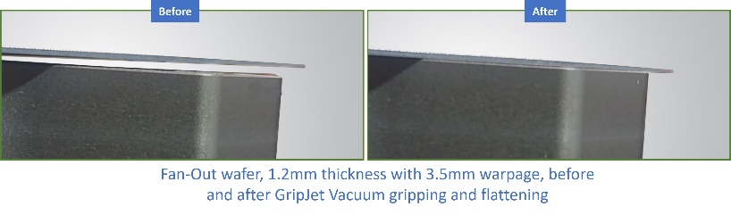 GripJet™ 技术采用特殊的流量放大器来提高真空流速,使其能够在无需软垫直接接触或任何机械整平机构的情况下,吸附并矫正严重翘曲的晶圆。该技术已成功矫正直径 300mm、翘曲度高达 8mm 的晶圆。GripJet™ 卡盘易于集成到现有工艺设备中,兼容 Class 100 洁净环境,并且由于其独特的无运动部件和无弹性材料设计,确保了高可靠性和洁净度